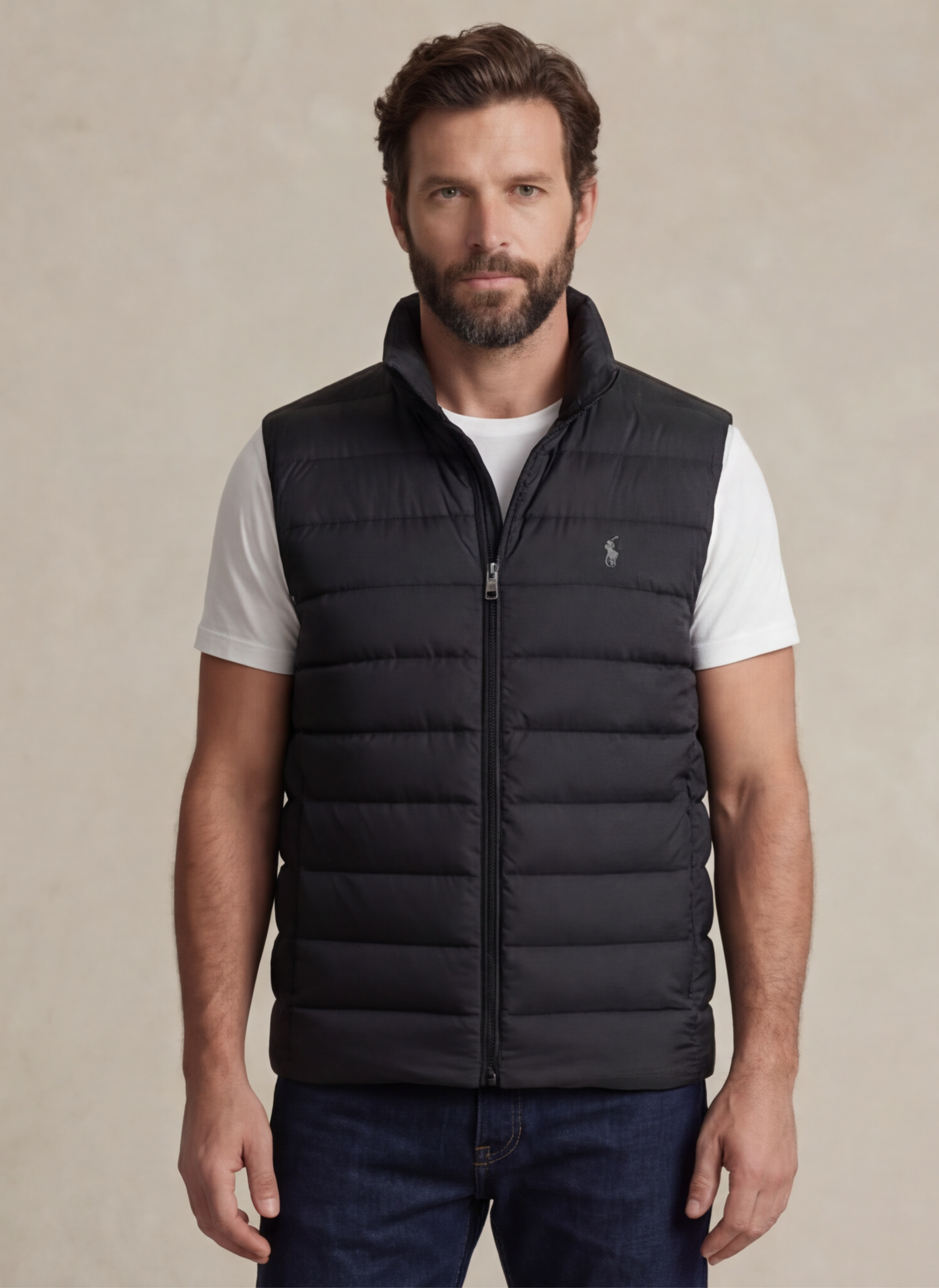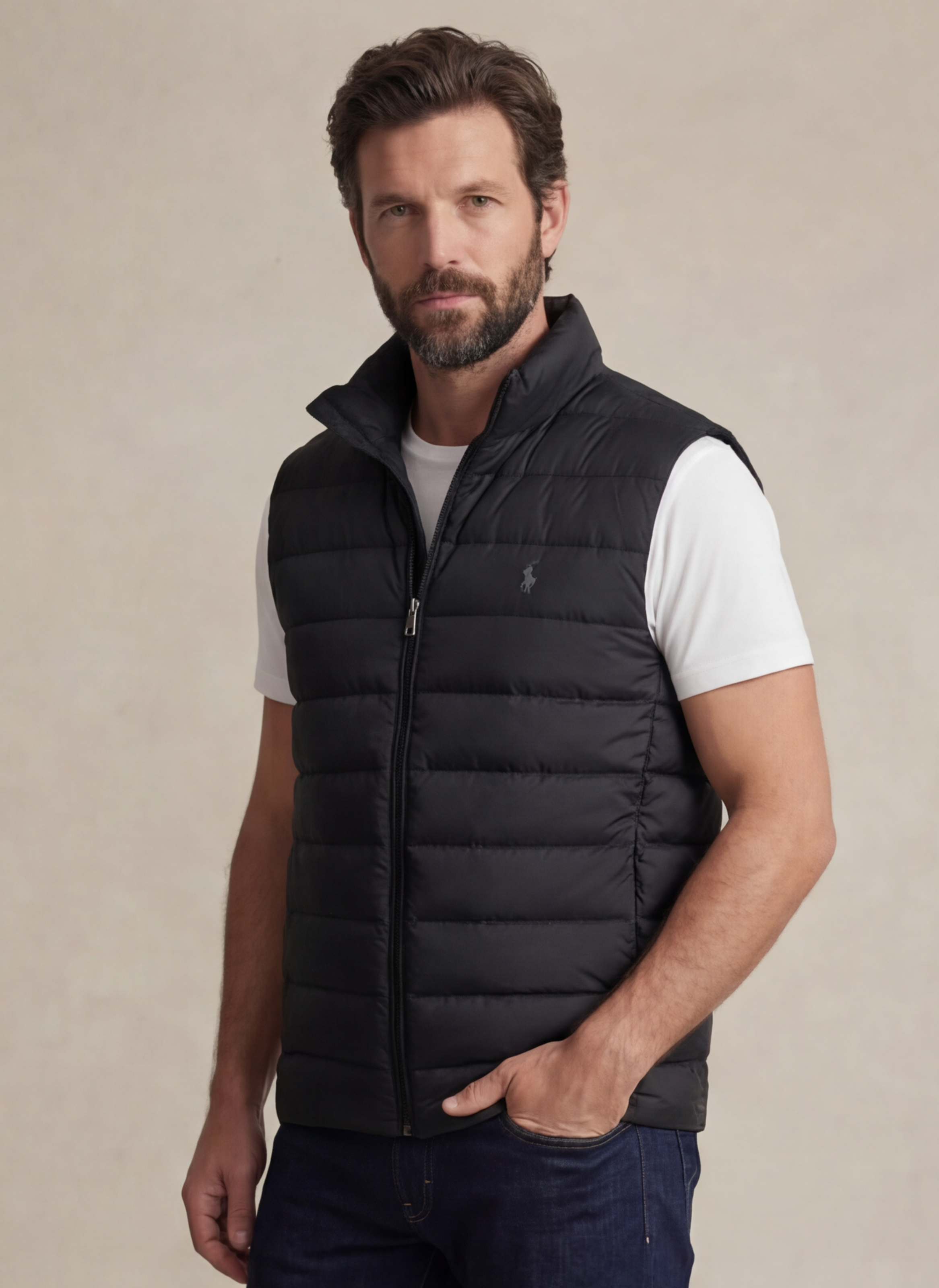 Affrontez le froid avec style grâce à cette veste sans manches Ralph Lauren en noir, alliant fonctionnalité et élégance.