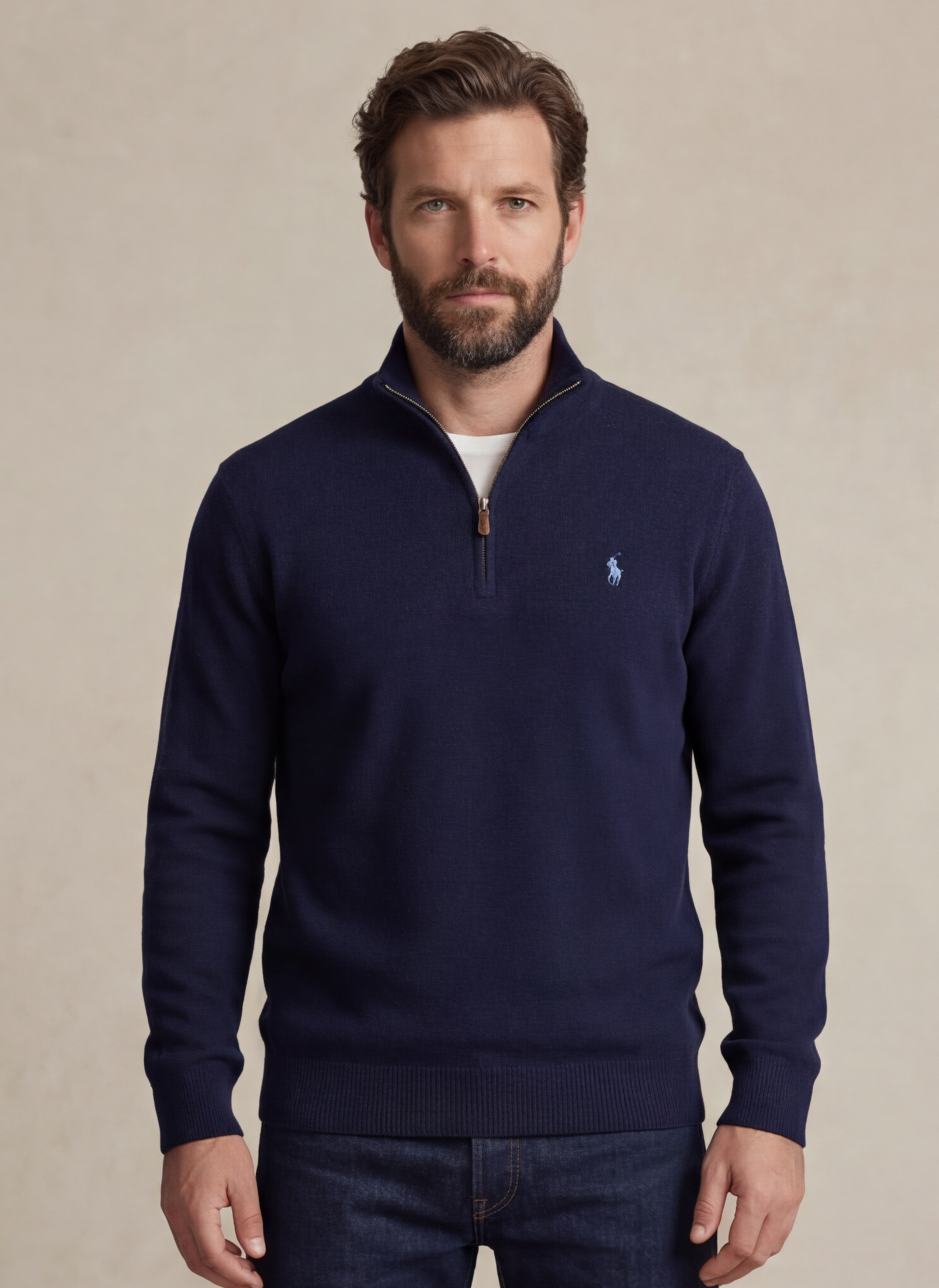 Ce pull à col montant en coton avec fermeture zippée offre un équilibre maîtrisé entre confort et élégance contemporaine. Sa coupe Regular Fit, légèrement plus ample au niveau de la poitrine, préserve une silhouette moderne et structurée.